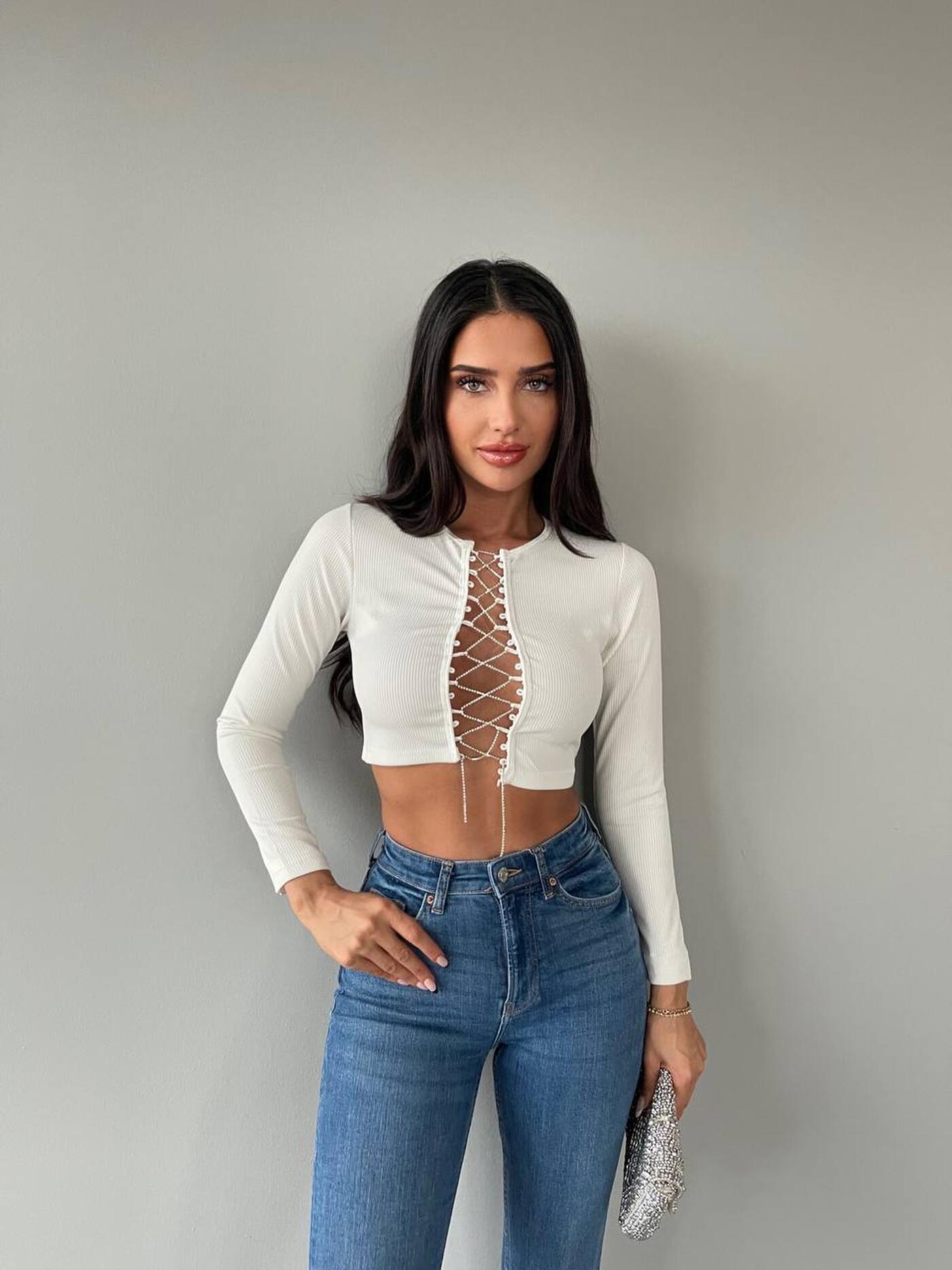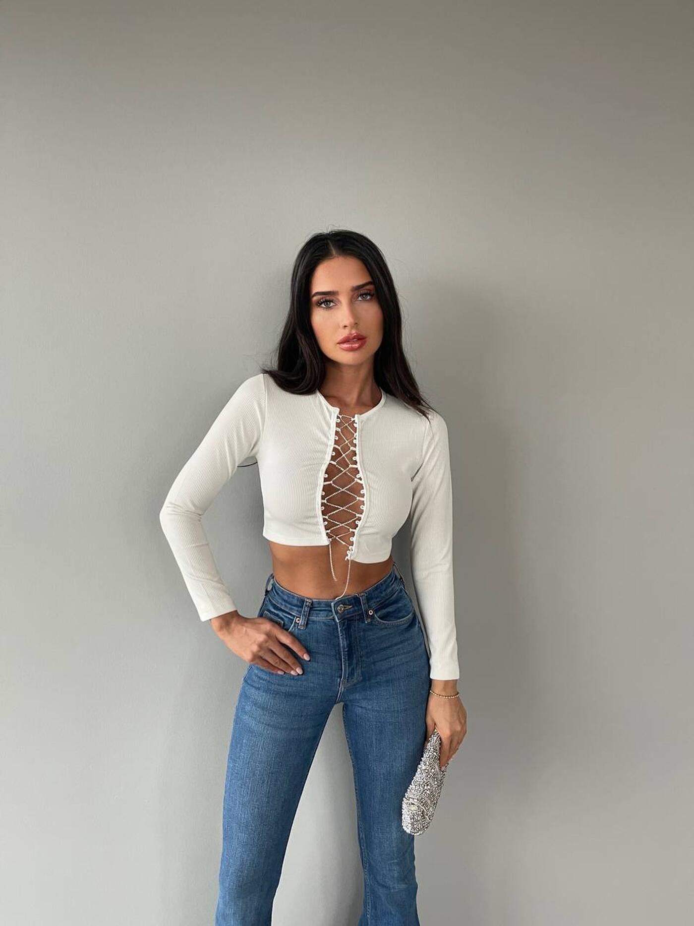 Acest top scurt alb cu mâneci lungi și detaliu de șiret frontal este ideal pentru o ținută modernă și îndrăzneață. Designul crop evidențiază talia, iar șiretul frontal oferă un aspect trendy, punând în valoare decolteul într-un mod subtil.