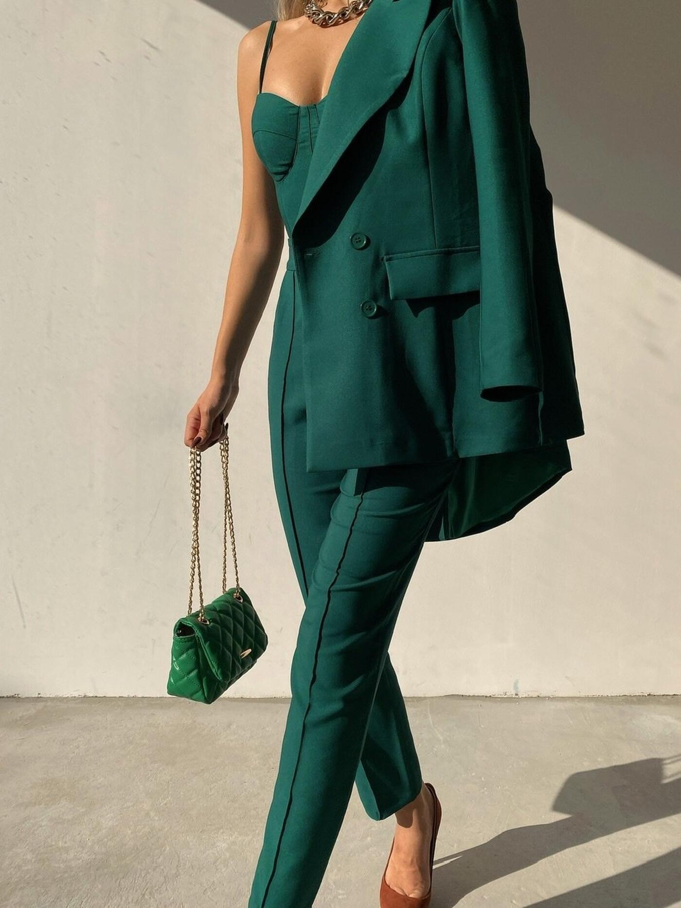 Costumul cu trei piese este o combinație elegantă și modernă, conceput să îmbine rafinamentul clasic cu o notă sexy. Sacoul este piesa centrală, croită impecabil cu o închidere la două rânduri de nasturi, oferind un aer sofisticat. Umerii sunt bine definiți, iar linia sacoului este elegantă, urmărind silueta într-un mod subtil, fără a fi prea strâmt.
