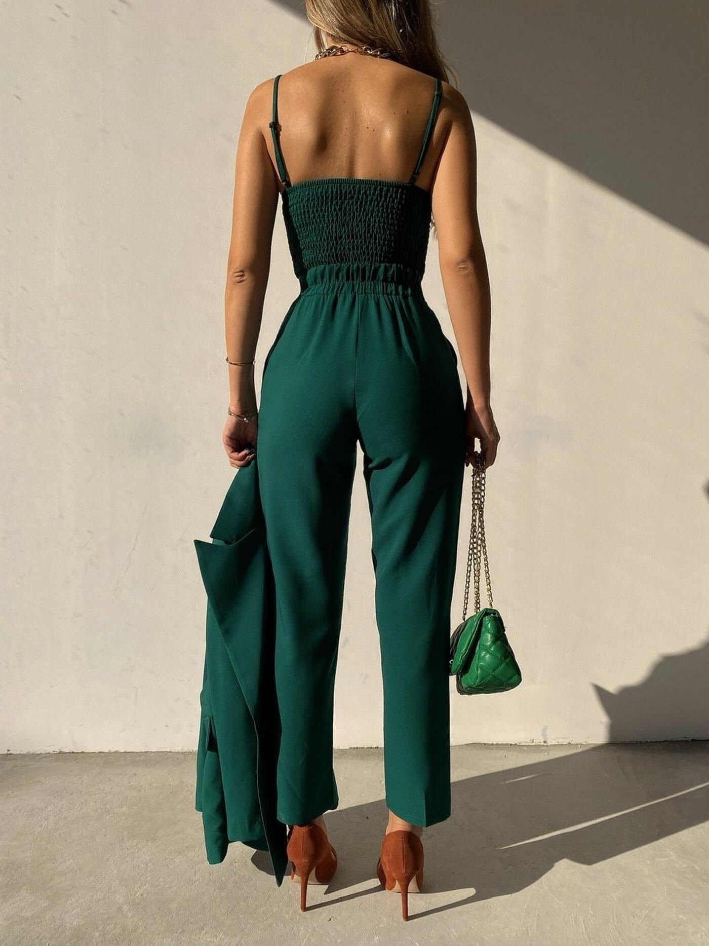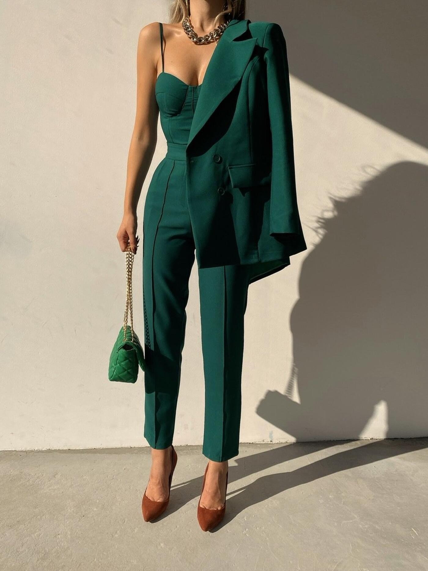 Pantalonii au o croială slim, perfect ajustați pe corp, alungind și subliniind picioarele. Talia este bine definită, iar linia pantalonilor cade grațios, adăugând un aspect sofisticat și modern. Întreg costumul emană eleganță și senzualitate, fiind ideal pentru femeia care dorește să îmbine stilul rafinat cu un look îndrăzneț și contemporan.
