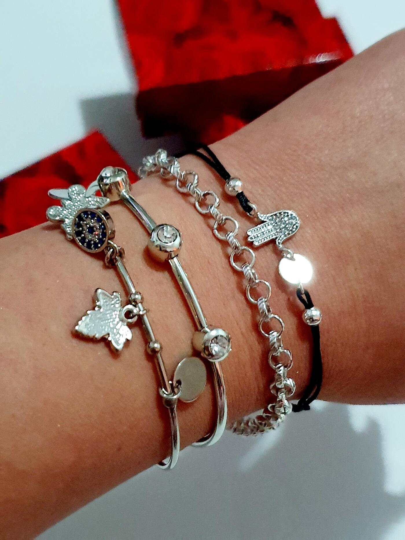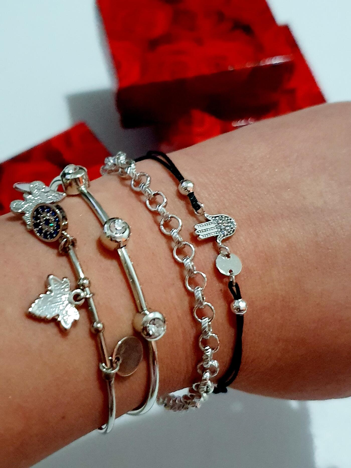 - Setul conține mai multe brățări cu diferite stiluri și detalii: una cu cristale strălucitoare, alta cu pandantive mici, cum ar fi un fluture și o mână, și una cu un șnur negru și bile mici. Aceste brățări pot fi purtate împreună sau separat, în funcție de preferințele tale.