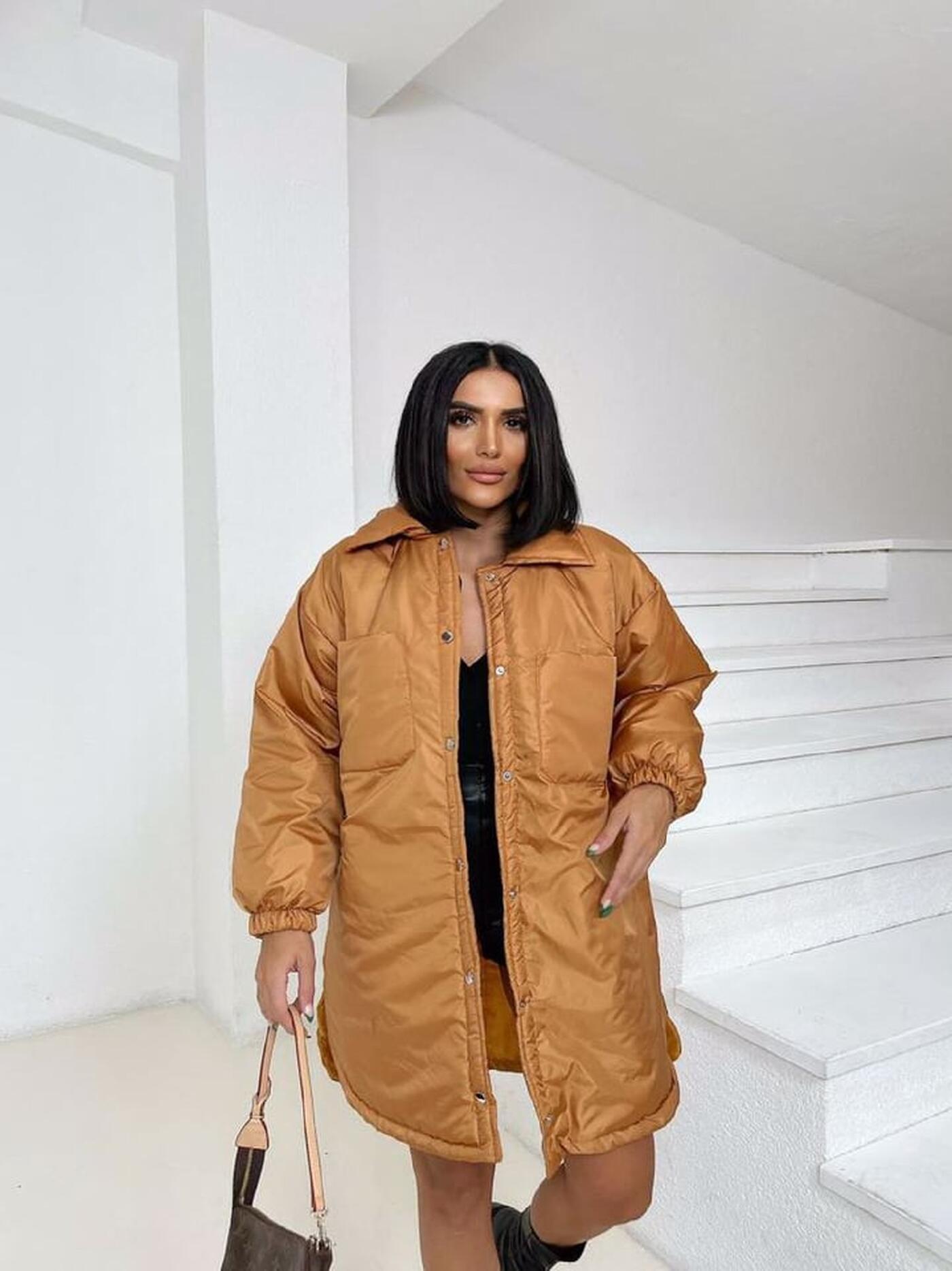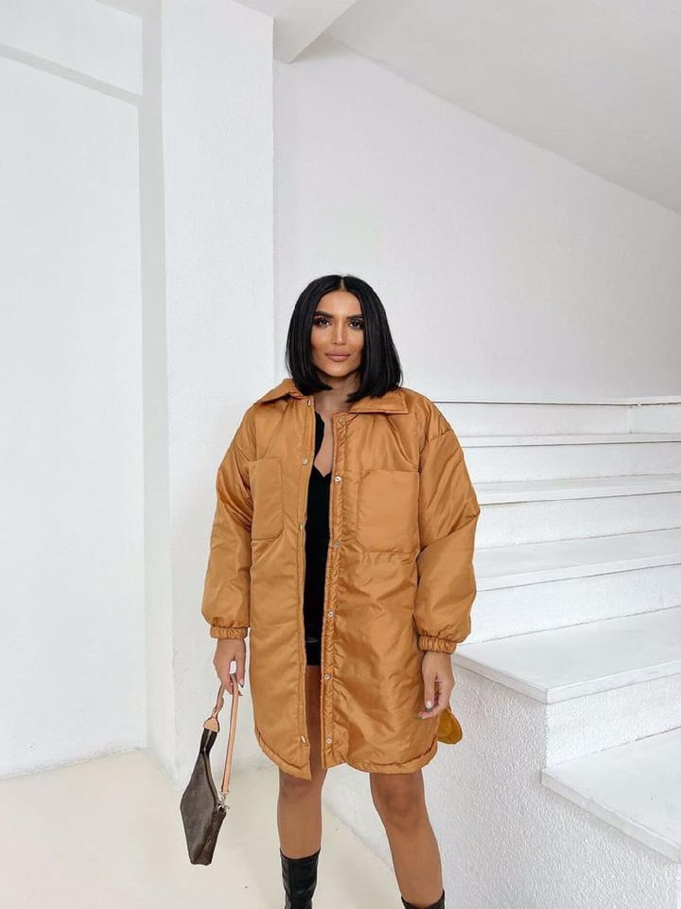 Această geacă puffer în nuanța caramel este o alegere excelentă pentru sezonul rece, oferind atât confort cât și stil. Croiala largă și materialul gros asigură protecție împotriva frigului, iar detaliile cu nasturi metalici și manșoane elastice adaugă un aer modern și funcțional.
