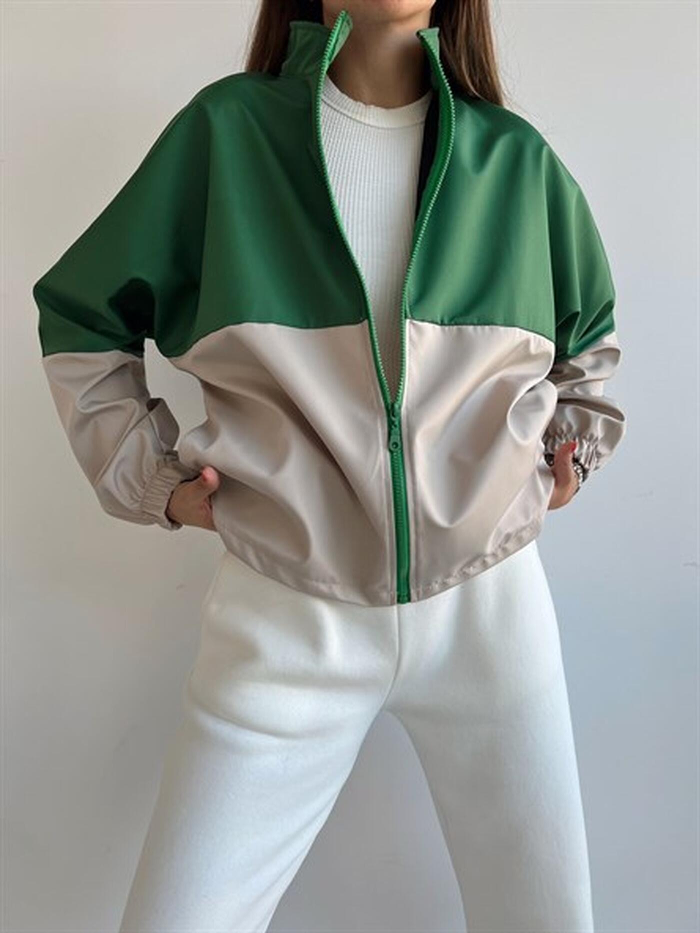 Această jachetă sport bicolor verde și bej este alegerea perfectă pentru un look casual și modern. Cu un design în blocuri de culoare, adaugă un aspect dinamic ținutei tale și este ideală pentru zilele răcoroase.