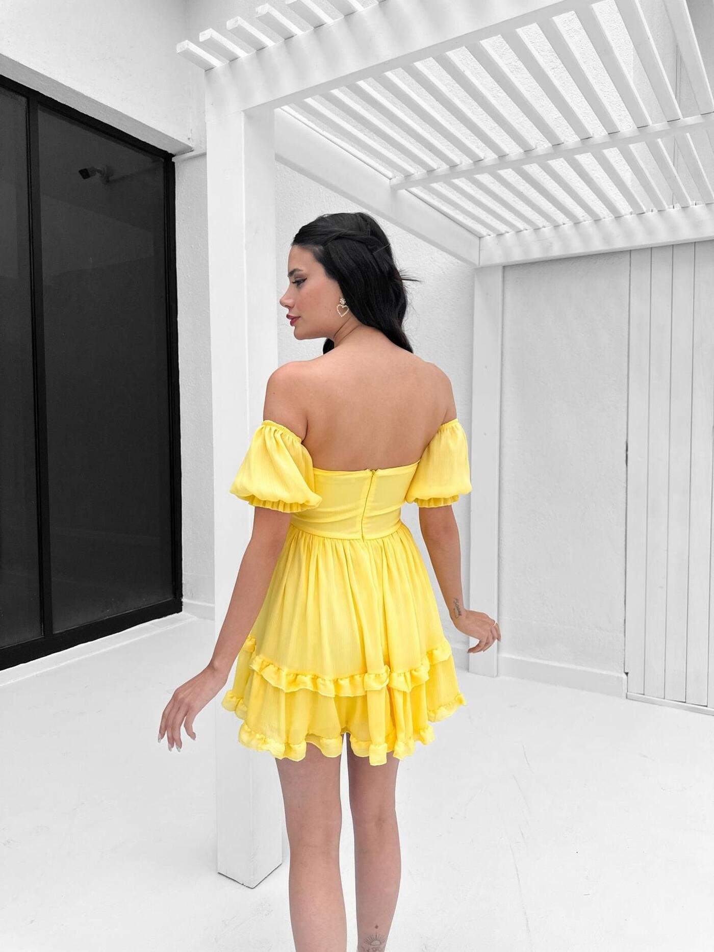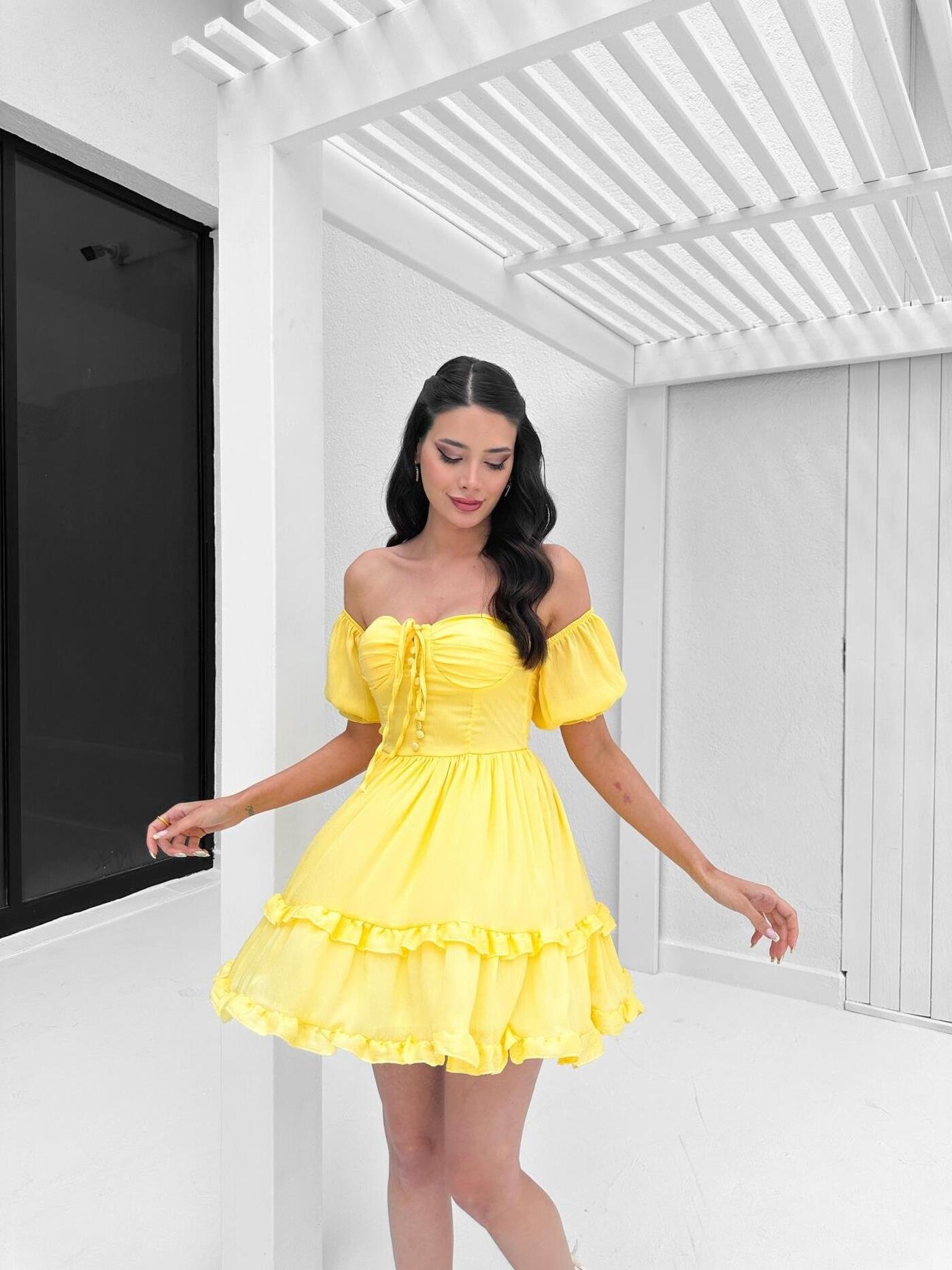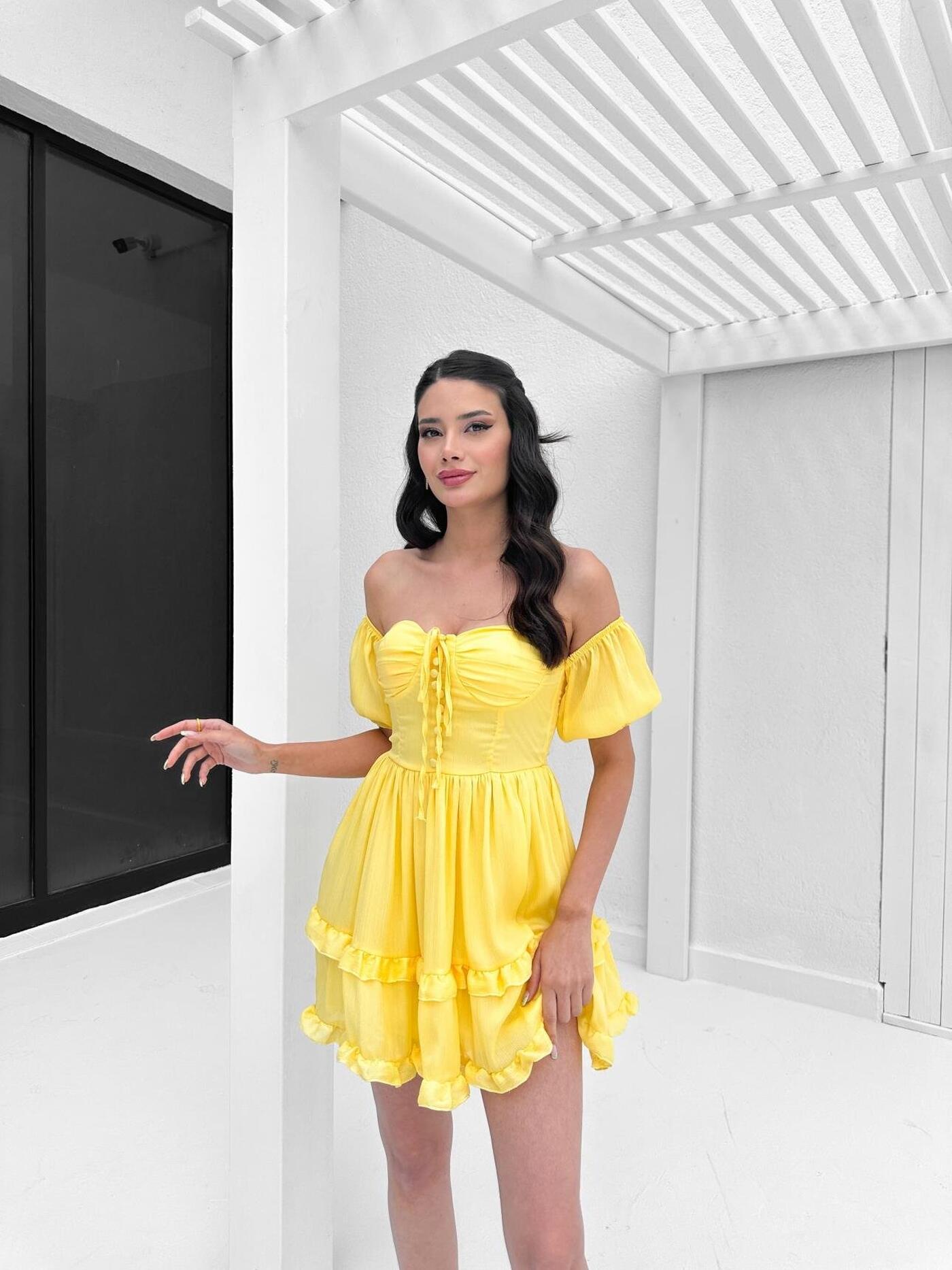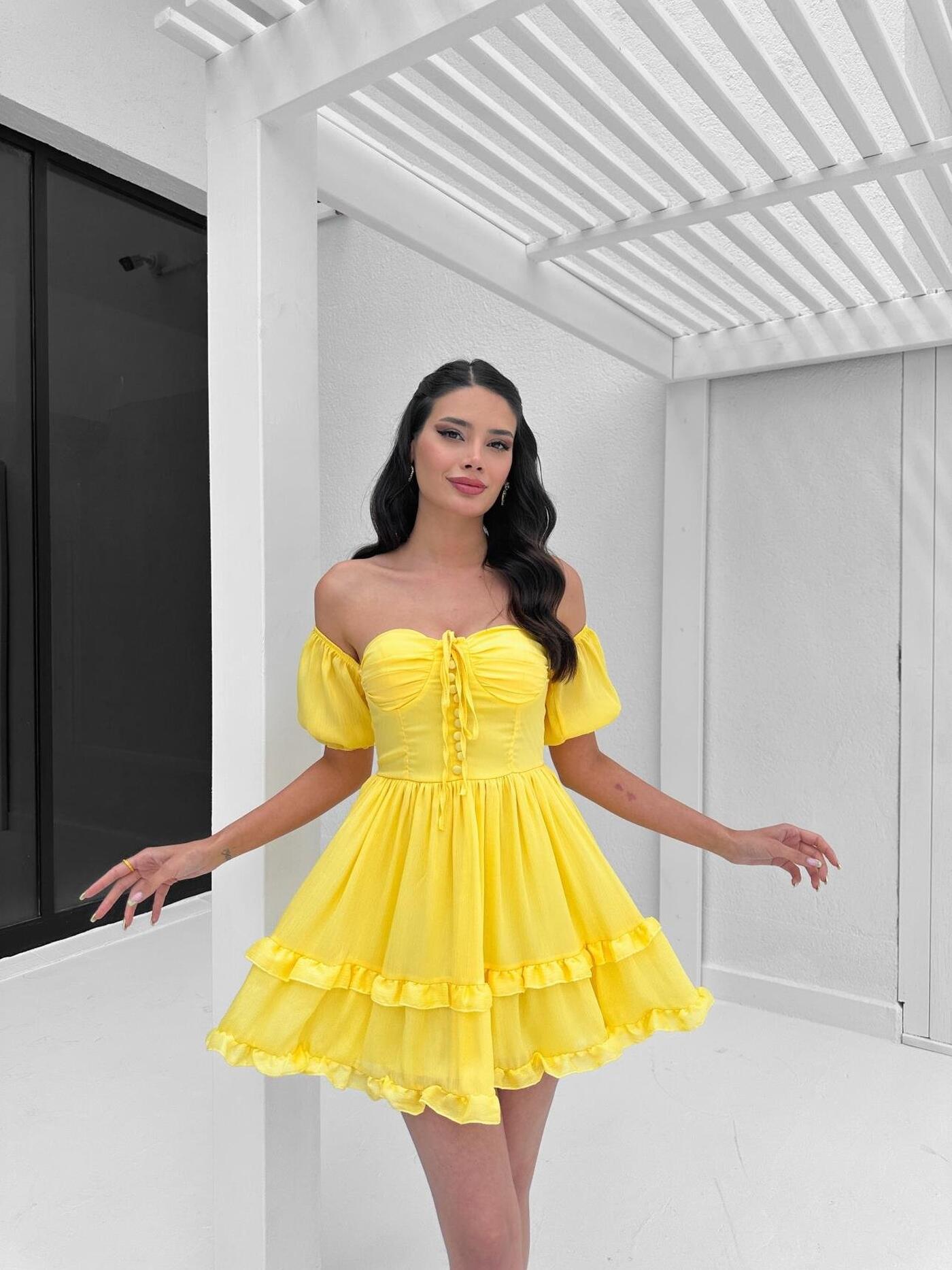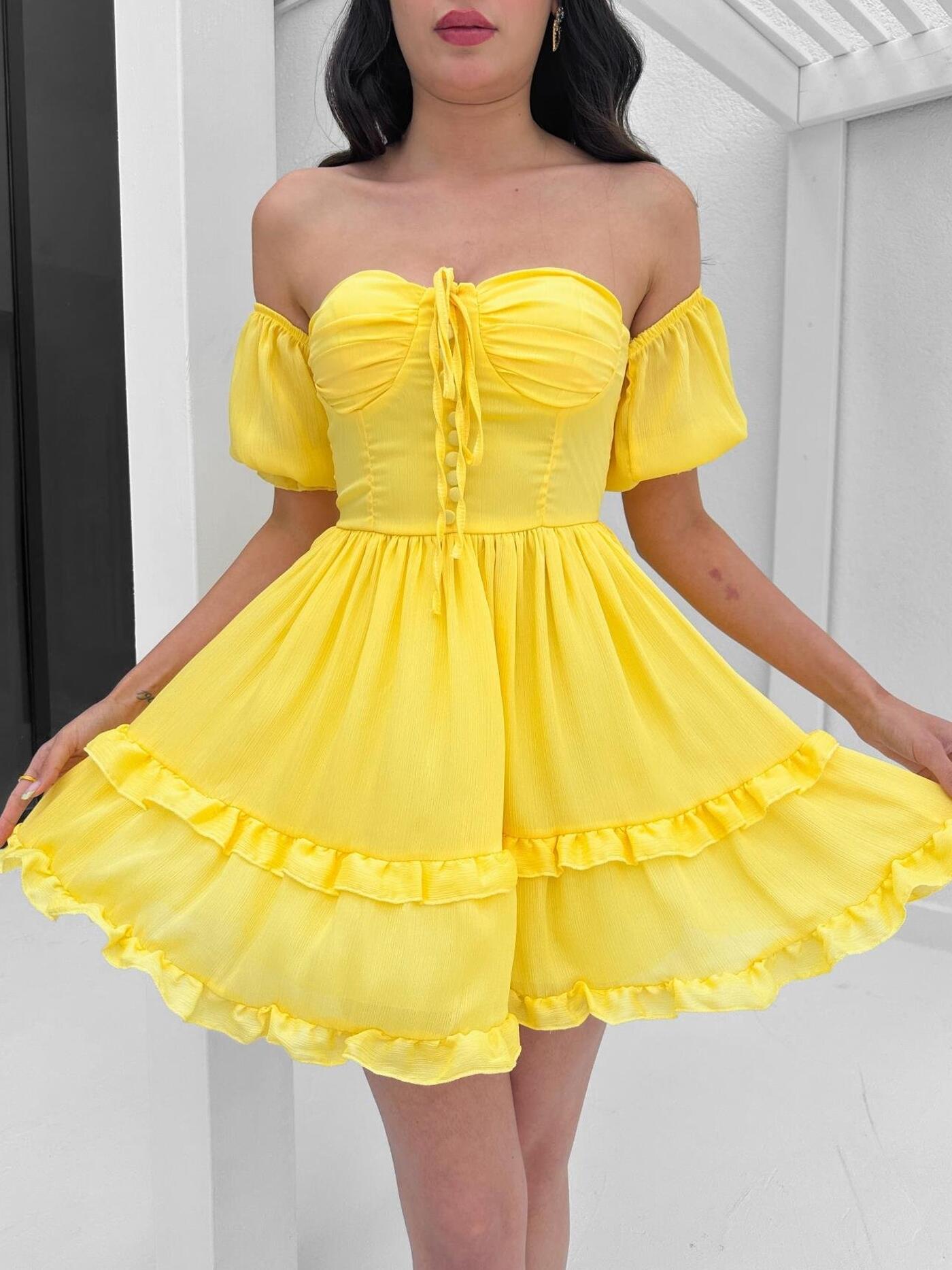 Descriere: Rochie scurtă galbena, ideală pentru un look elegant și delicat. Cu un design decoltat pe umeri și detalii de volane la nivelul fustei, această rochie adaugă un plus de feminitate și stil. Bustul evidențiat și panglica decorativă oferă un aspect romantic, perfect pentru evenimente de zi sau ieșiri speciale.