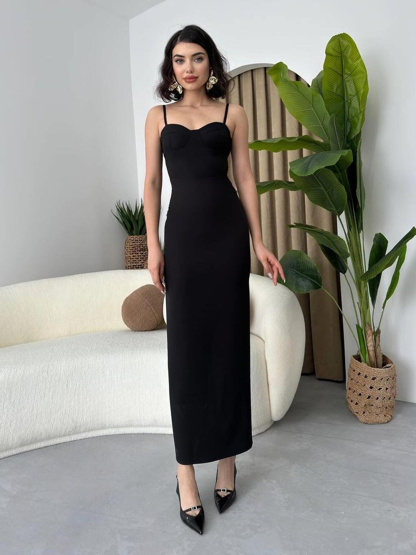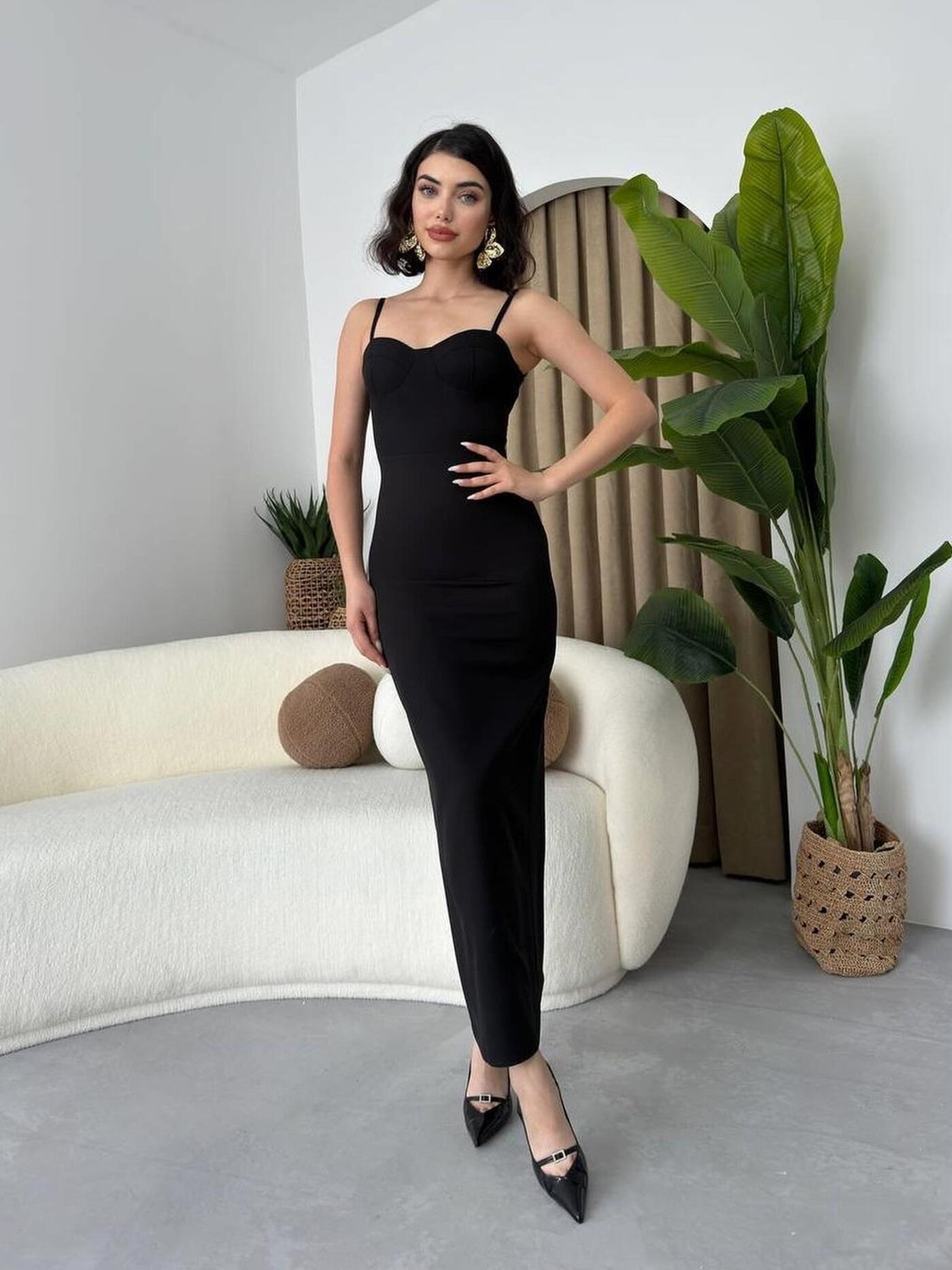Această rochie midi neagră impresionează prin simplitate și detalii subtile, care adaugă un aer de mister și eleganță. Designul cu bretele subțiri și decolteu în formă de inimă scoate în evidență linia delicată a bustului, iar spatele gol cu fundițe delicate adaugă un element surprinzător și rafinat. Croiala mulată evidențiază silueta, făcând din această rochie o alegere ideală pentru evenimente speciale în care dorești să ieși în evidență cu un look minimalist și chic.