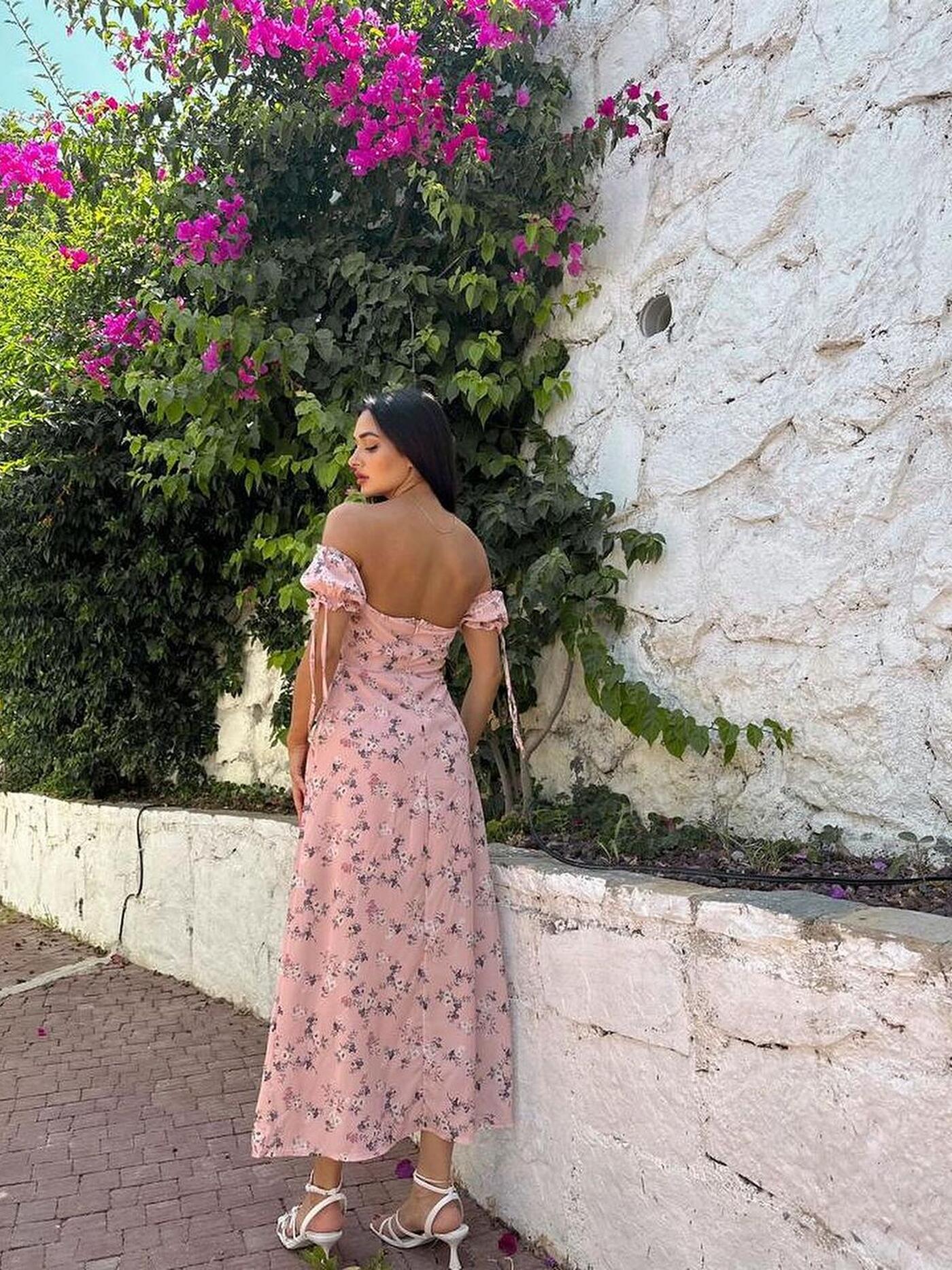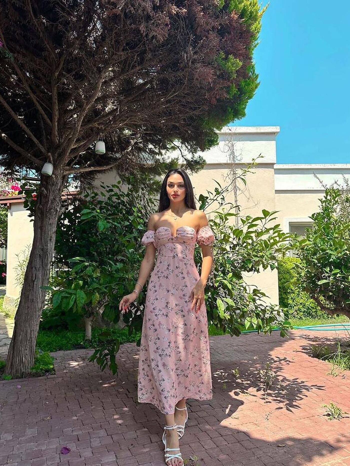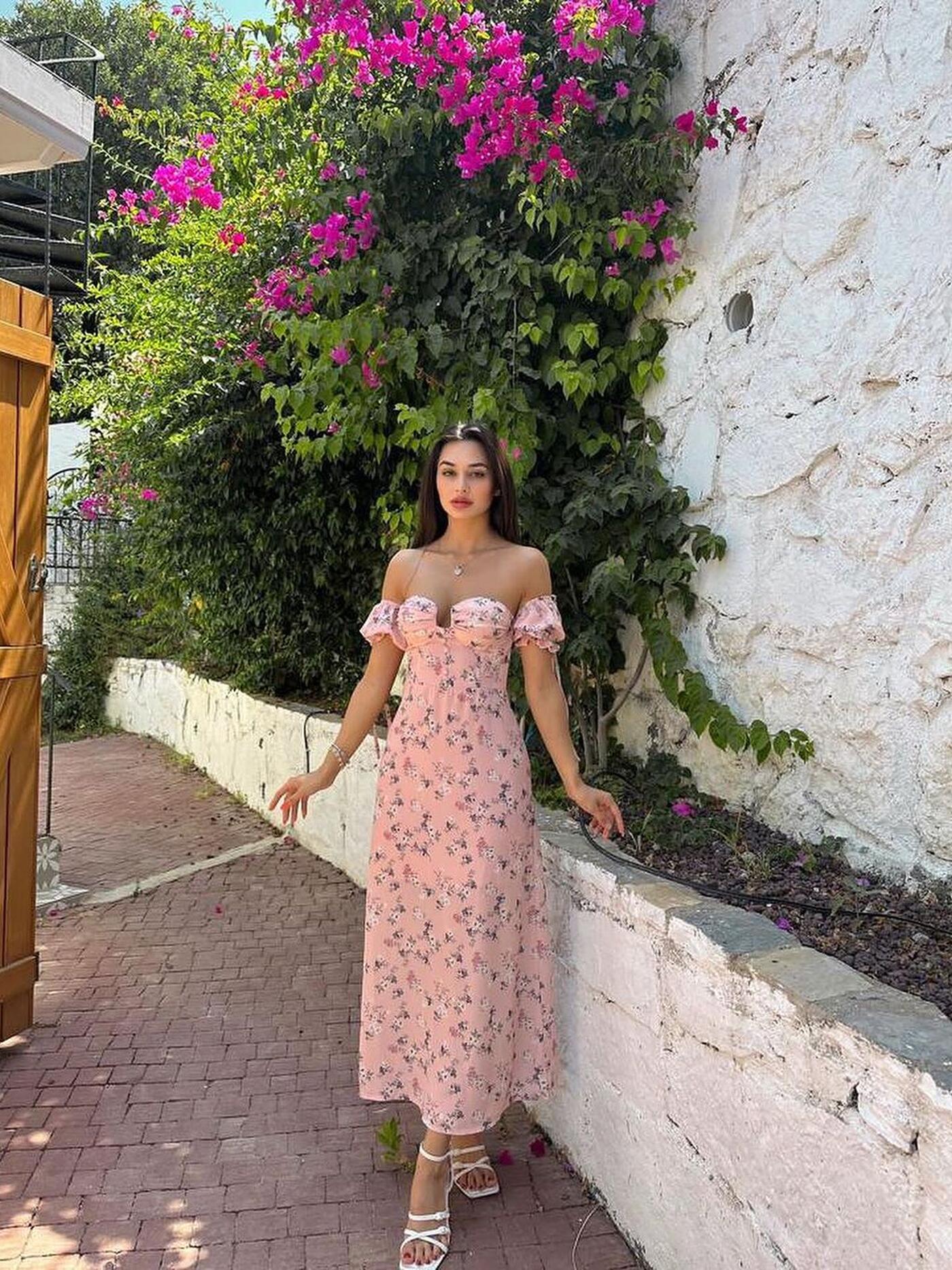 Această rochie midi roz, decorată cu un imprimeu floral delicat, este alegerea perfectă pentru un look feminin și grațios. Decolteul în formă de inimă și mânecile bufante căzute adaugă un aer romantic, scoțând în evidență umerii și linia bustului într-un mod subtil. Croiala lejeră și materialul vaporoas permit o mișcare elegantă, făcând această rochie ideală pentru plimbări, întâlniri sau evenimente de zi. Este o piesă versatilă care adaugă un plus de prospețime și rafinament garderobei tale.