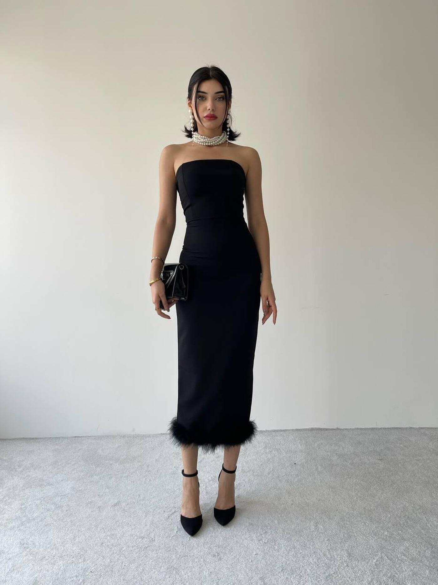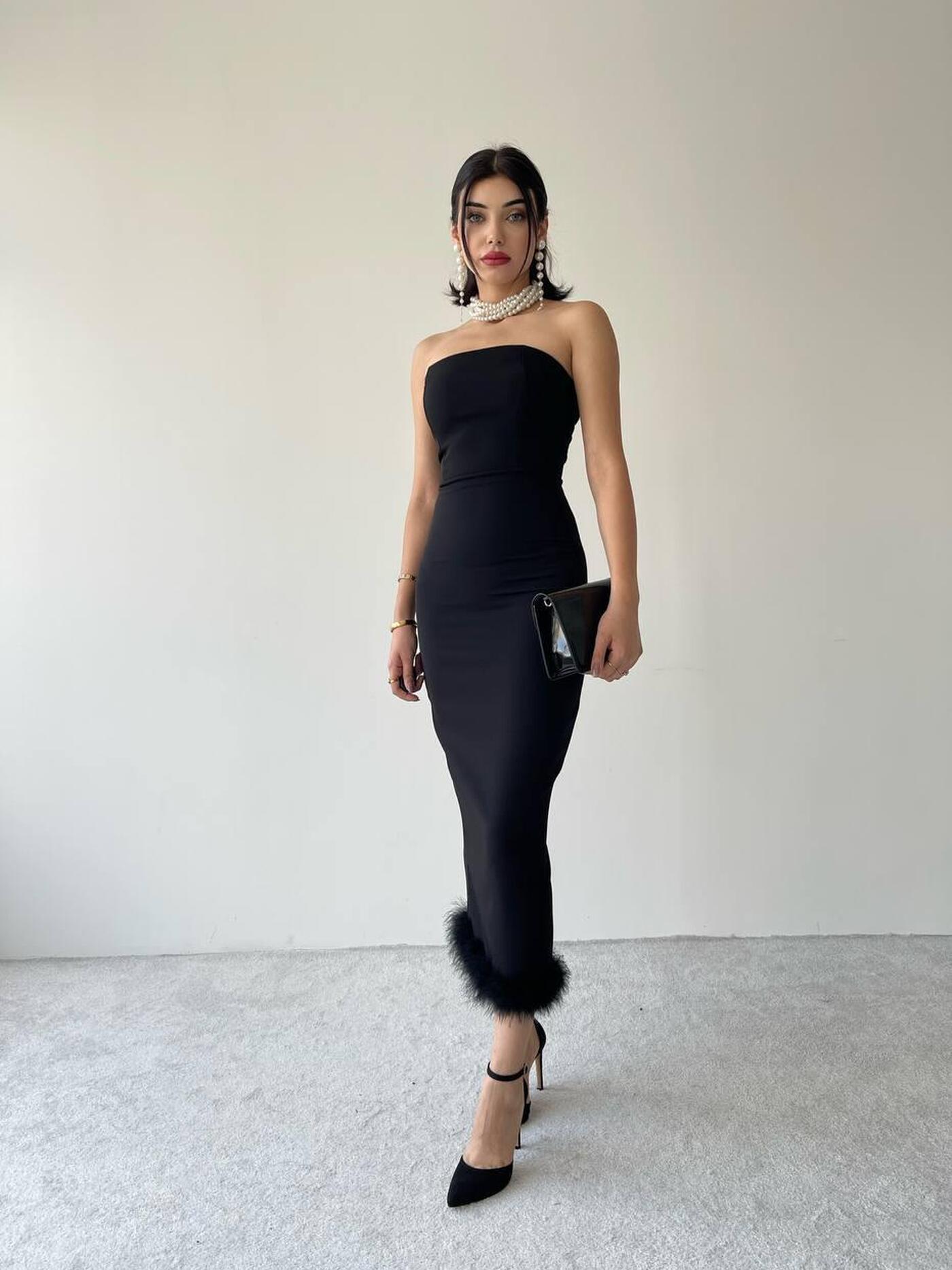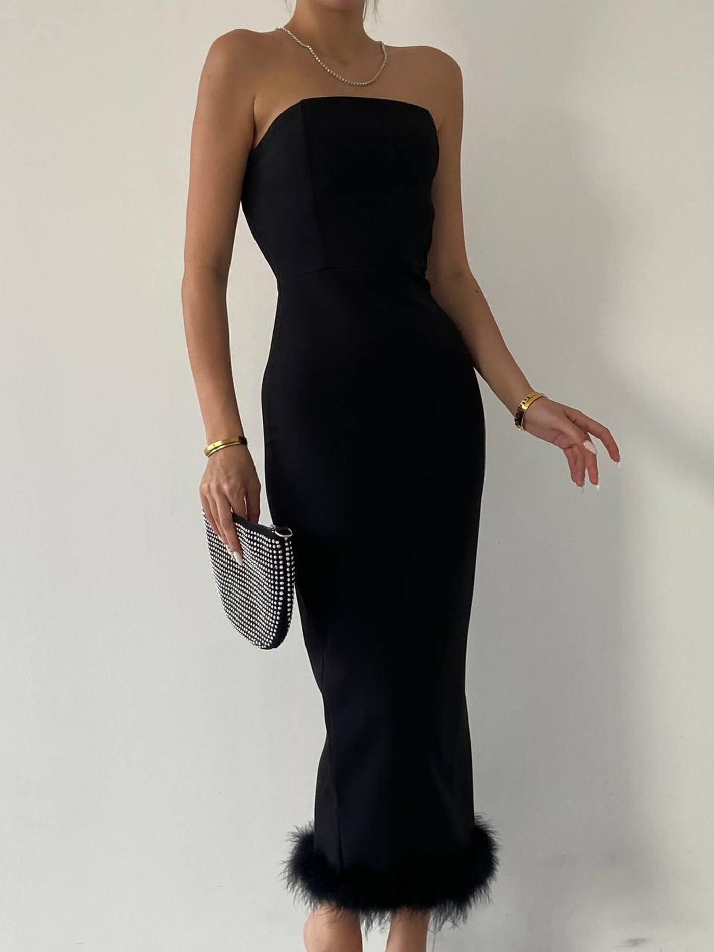 Această rochie neagra midi fără bretele emană senzualitate și eleganță într-un mod simplu și sofisticat. Croiala mulată evidențiază linia corpului, oferind un look rafinat și feminin. Detaliul de blană de la tiv adaugă un element de lux și distincție, transformând această rochie într-o alegere ideală pentru serile speciale. Designul fără bretele permite un look rafinat și atrăgător, perfect pentru femeile care își doresc să impresioneze.
