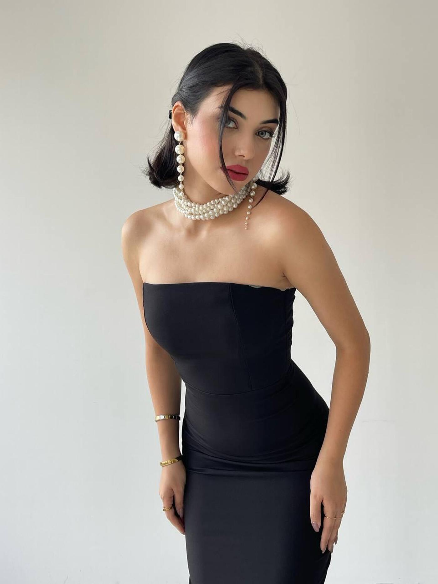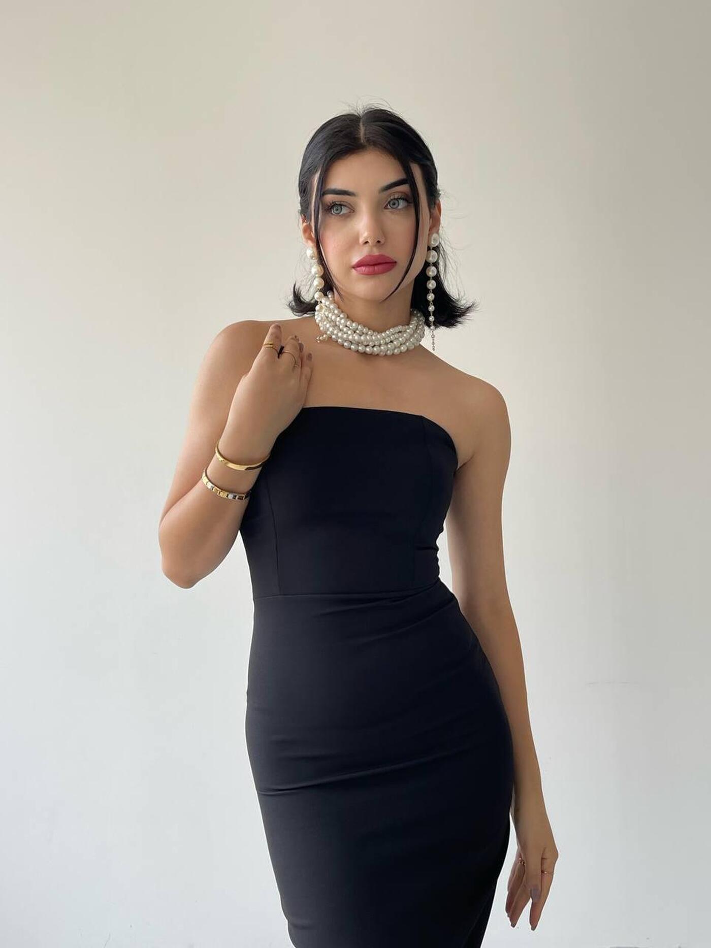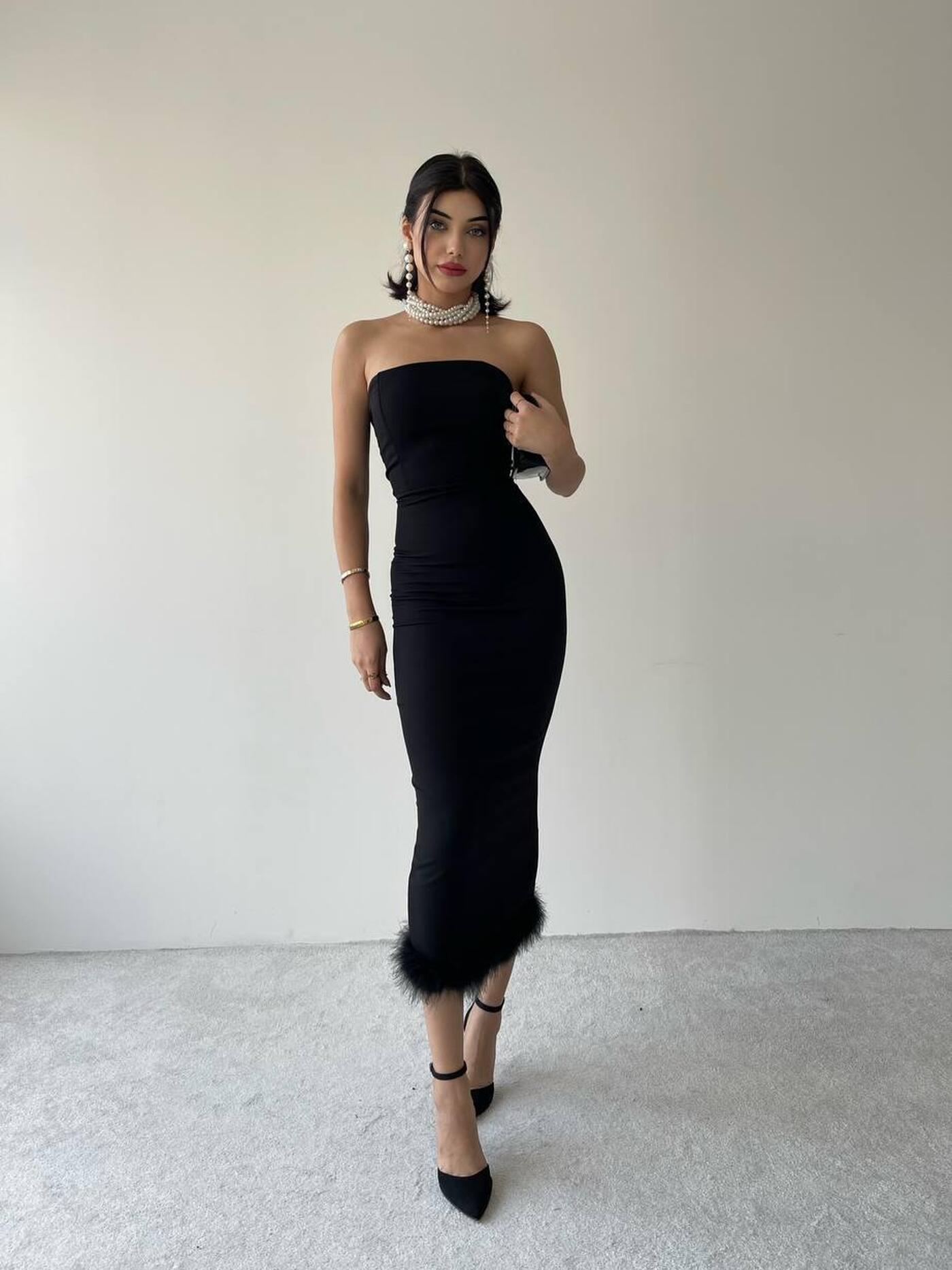 Această rochie neagra midi fără bretele emană senzualitate și eleganță într-un mod simplu și sofisticat. Croiala mulată evidențiază linia corpului, oferind un look rafinat și feminin. Detaliul de blană de la tiv adaugă un element de lux și distincție, transformând această rochie într-o alegere ideală pentru serile speciale. Designul fără bretele permite un look rafinat și atrăgător, perfect pentru femeile care își doresc să impresioneze.