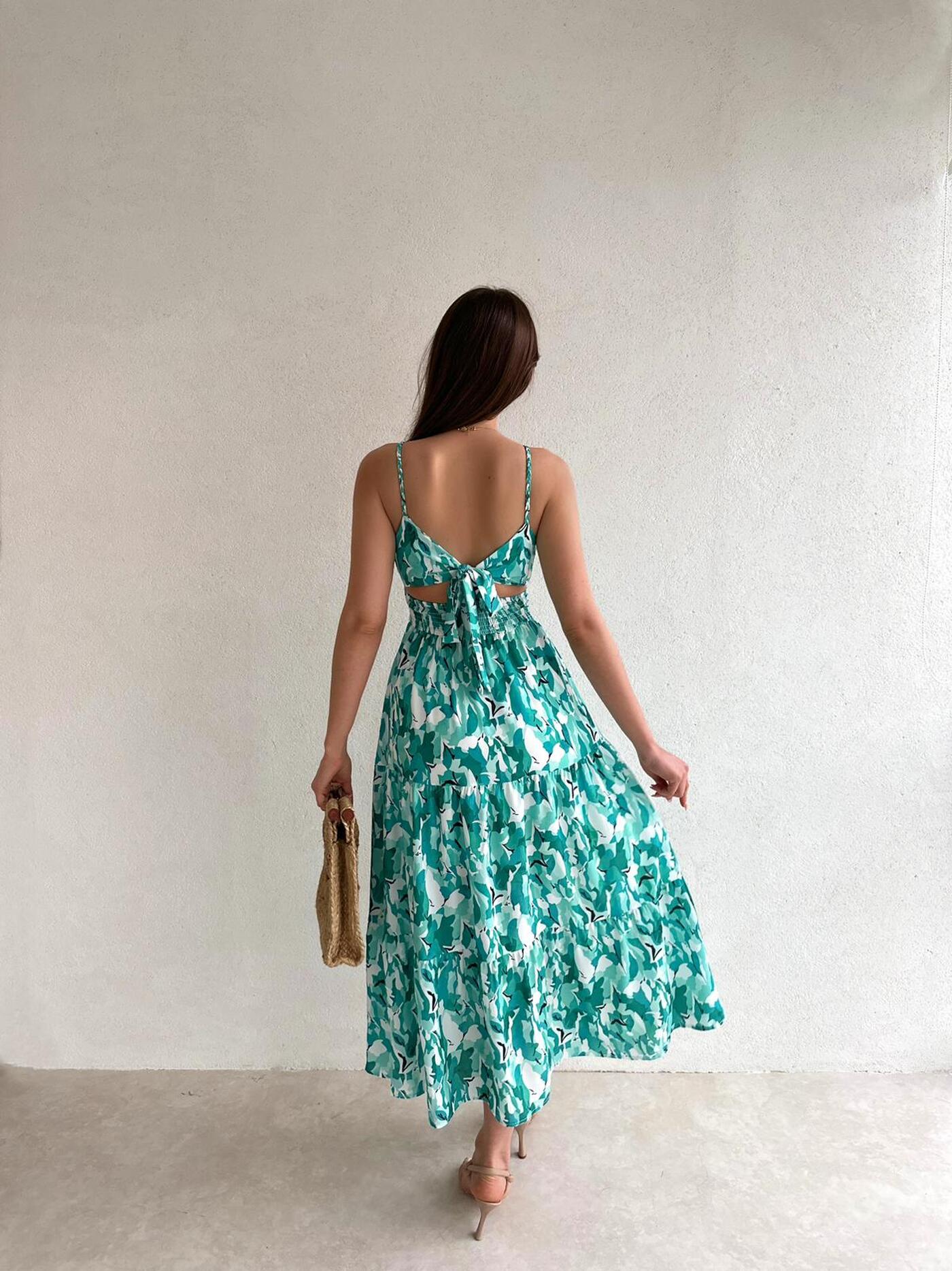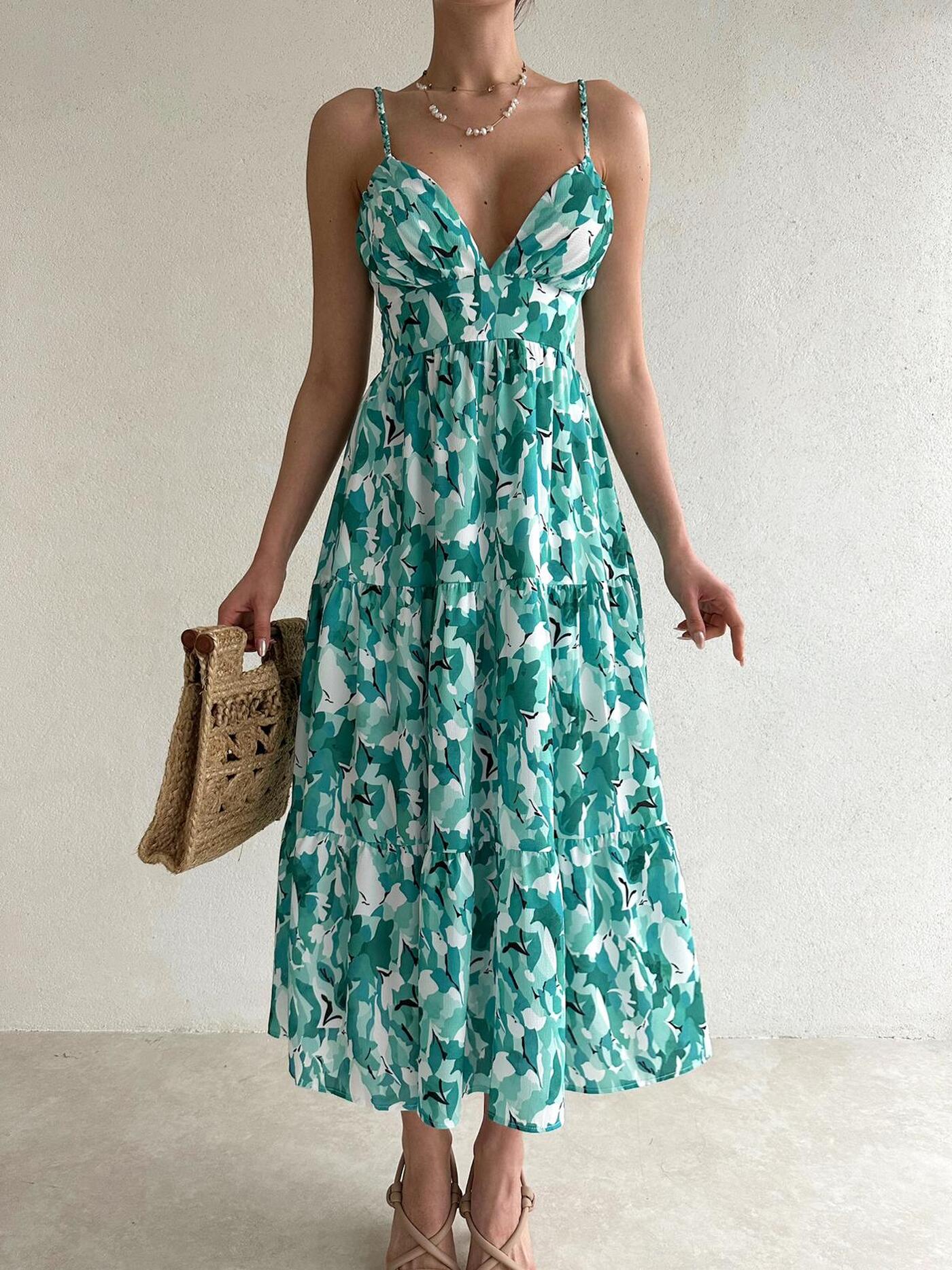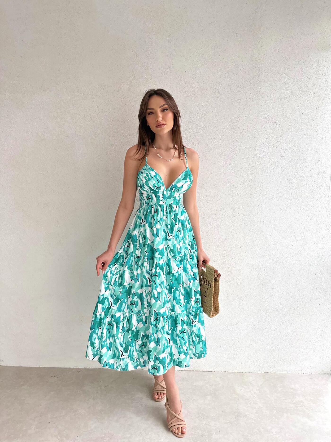 Rochie midi verde cu imprimeu floral, bretele subțiri și decolteu în formă de inimă, ideală pentru un look fresh și feminin. Fusta evazată oferă lejeritate și un aer romantic, fiind perfectă pentru zilele însorite sau evenimentele casual. Materialul ușor o face potrivită pentru sezonul cald, completând o ținută relaxată, dar elegantă.