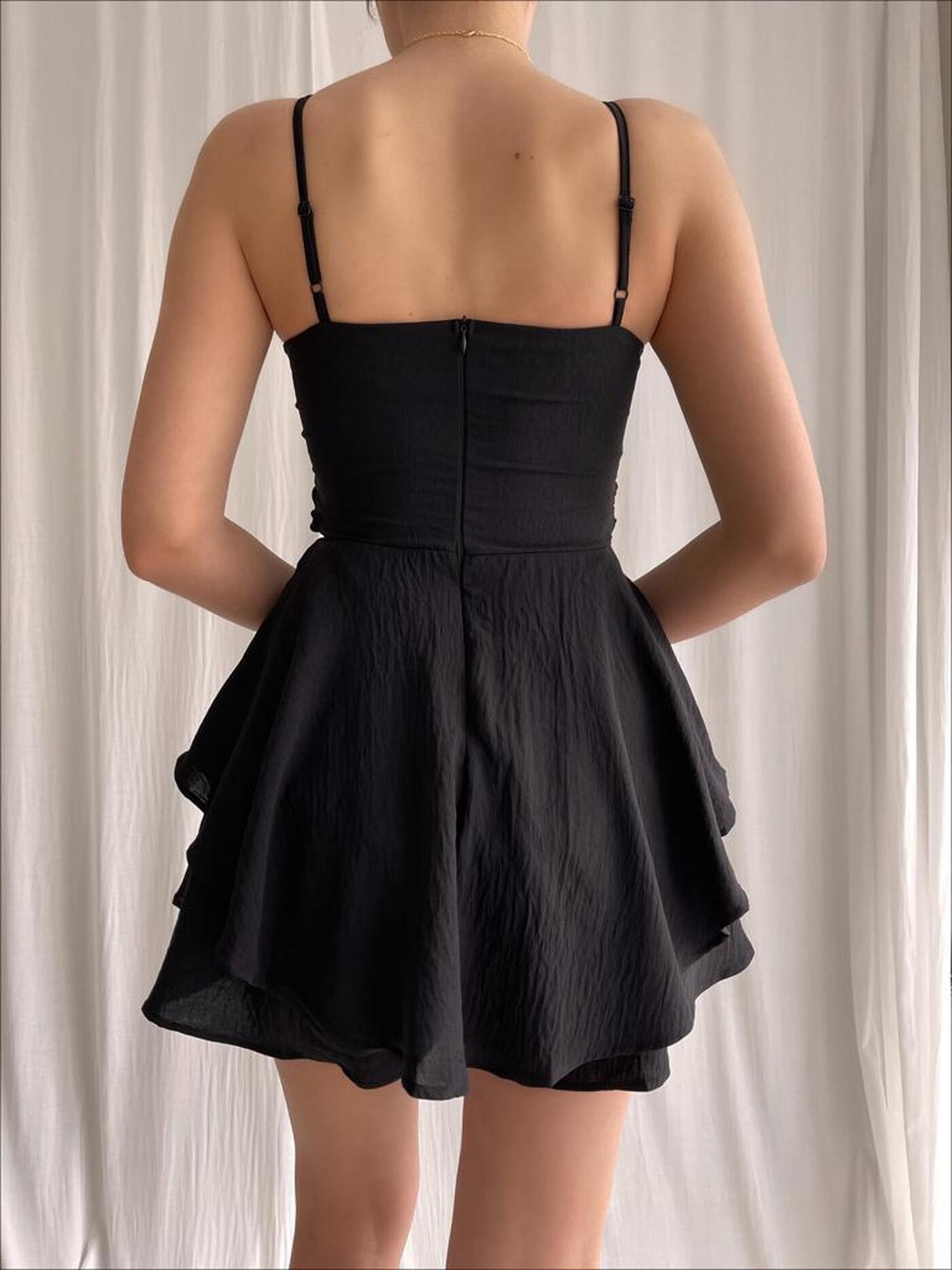 Această salopetă scurtă de culoare neagră îmbină eleganța unei rochii cu confortul unei salopete, fiind perfectă pentru ieșirile în oraș sau evenimentele casual-chic. Designul petrecut pe bust conferă o notă sofisticată, iar bretelele subțiri adaugă un aer feminin și delicat. Fusta scurtă cu aspect de pantaloni și textura materialului îi oferă o notă modernă și elegantă.