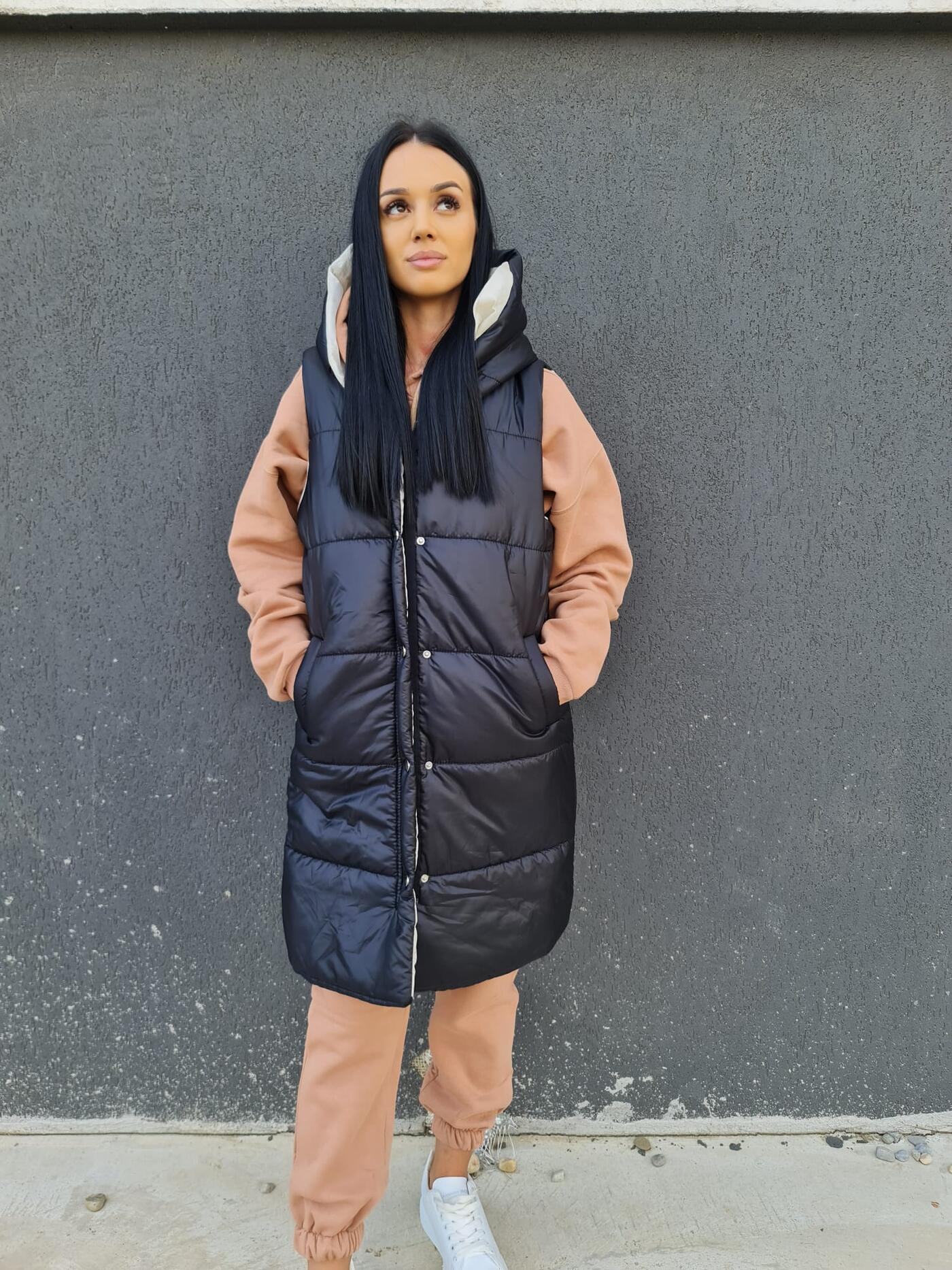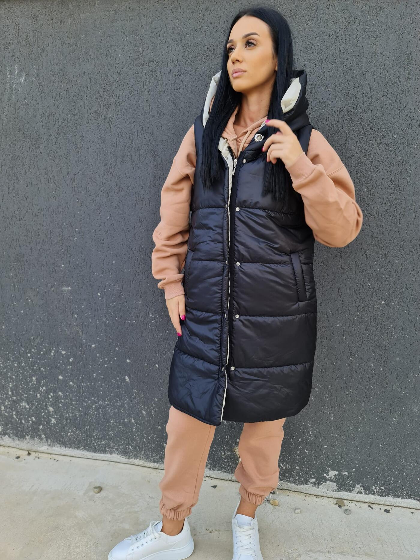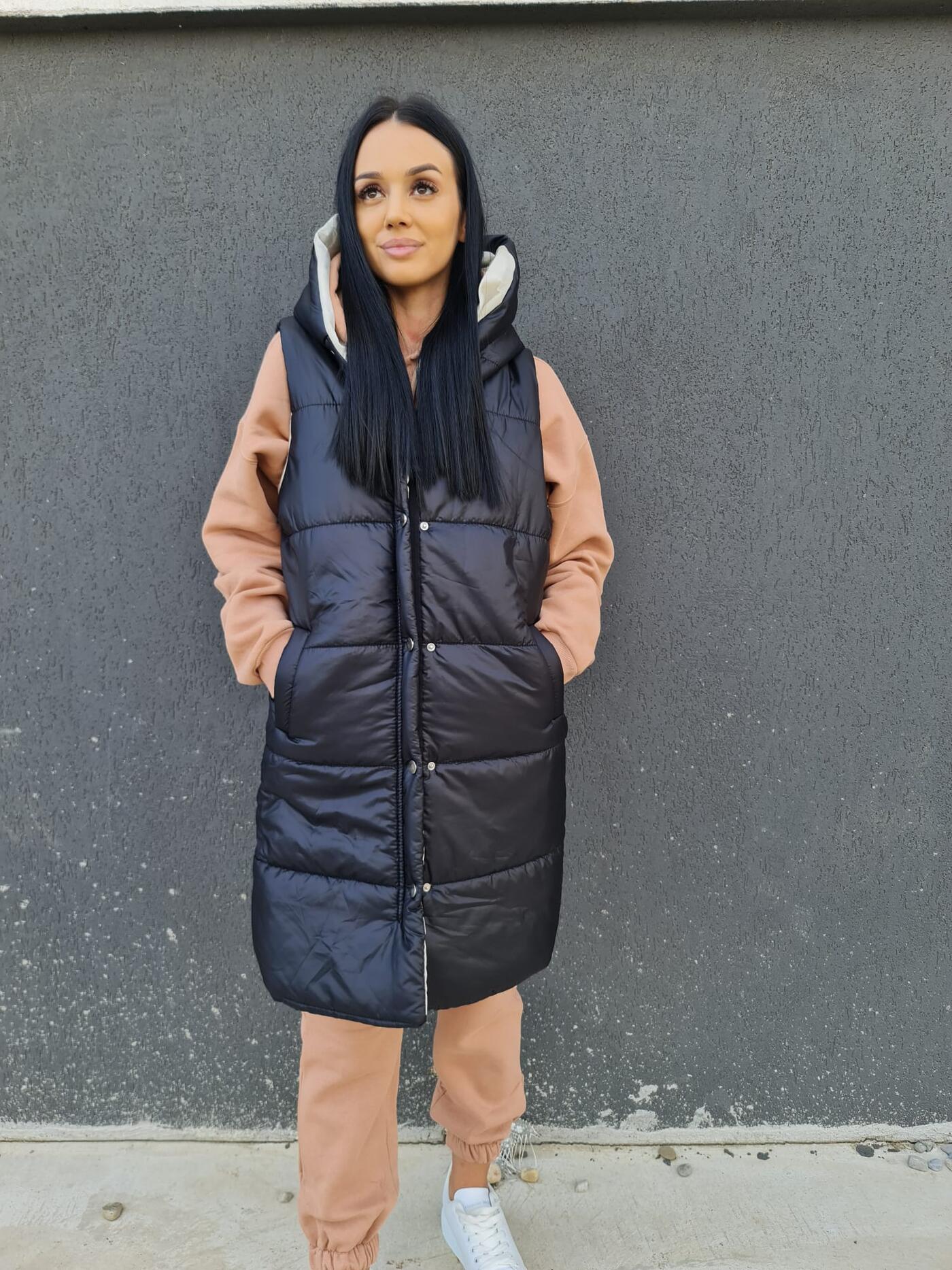Această vestă neagră lungă este perfectă pentru zilele răcoroase, oferind atât căldură, cât și un stil casual modern. Este dotată cu o glugă confortabilă, ceea ce o face ideală pentru un look practic și versatil. Detaliile de cusături și capsele metalice completează designul acestei veste călduroase.